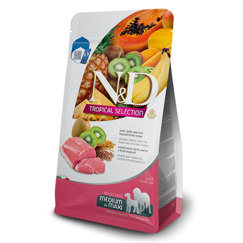Корм для собаки >N&D Tropical Selection для собакСвинина, спельта, овес, тропические фрукты. Полнора..
