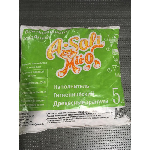 - Наполнитель древесный впитывающий А-Соли/A-Soli Mii-o Хвойный 3л/1,75кг*5 127 р.