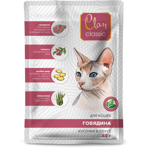 Клан/Clan Classic пауч корм для кошек соус Говядина с клюквой и спирулиной 85гр*14