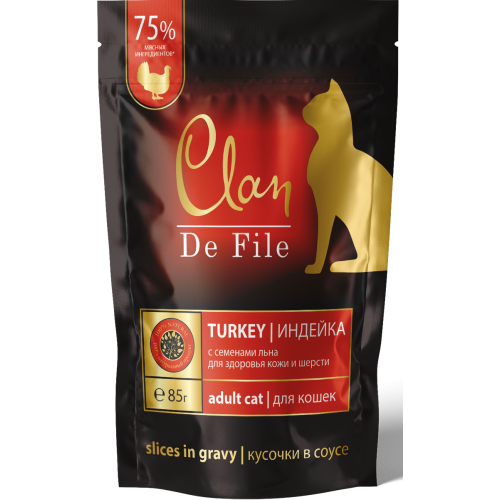 130.3.111 CLAN De File пауч кусочки в соусе для кошек 85г, Креветки и семена льнаСостав: мясо и м..