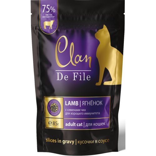 130.3.114 CLAN De File пауч кусочки в соусе для кошек 85г, Ягненок с семенами чиаСостав: мясо и м..