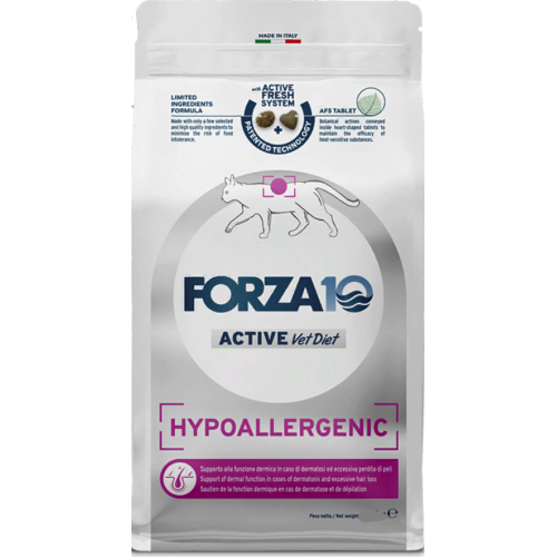 FORZA 10 HYPOALLERGENIC ACTIVE — Это сбалансированная диета, разработанная научно-исследовательским отделом компании SANYpet, для взрослых кошек с признаками пищевой непереносимости, затрагивающие кожный покров и её производные (перианальные железы), ротовую полость, глаза, нос и уши.