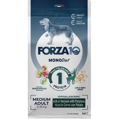 Forza10 MEDIUM DIET из оленины и картофеля – полнорационный, гипоаллергенный корм для собак аллергиков, продукт диетической линии компании SANYpet для всех пород, средних размеров, чувствительных к мясу интенсивного животноводства.