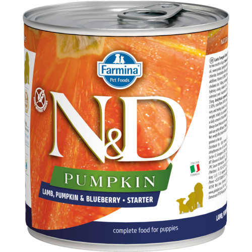 •  Фармина/Farmina  консервы N&D Pumpkin корм для щенков Ягнёнок с тыквой и черникой  285гр