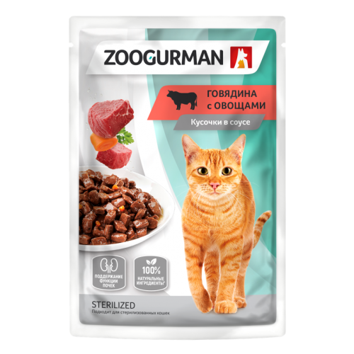 Зоогурман. Корм консервированный полнорационный для взрослых кошек с говядиной. «Говядина с овощами» Поддержка функции почек. Кусочки в соусе.