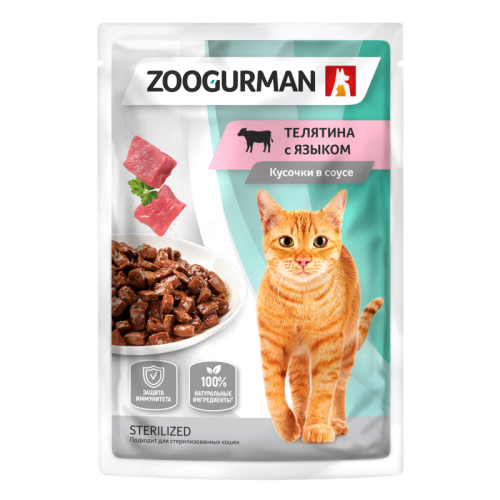 Зоогурман. Корм консервированный полнорационный для взрослых кошек с телятиной. «Телятина с языком» Защита иммунитета. Кусочки в соусе.