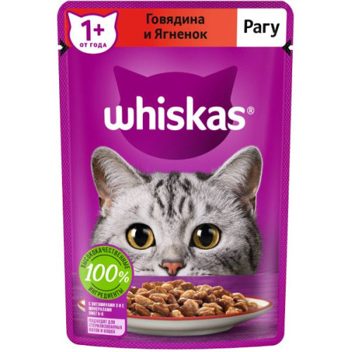 - Вискас/Whiskas 75гр пауч корм для кошек желе говядина/ягненок 29 р.