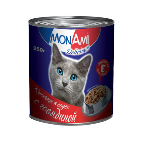 Влажный корм «МонАми» ГОВЯДИНА Кусочки в соусе 250 граммовСостав: Мясо говядины и субпродукты мясные..