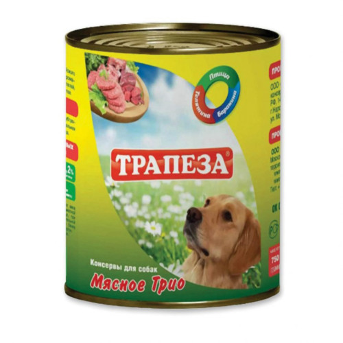 Влажный корм «Трапеза» Мясное трио» 750 грСостав: Мясо говядины, мясо баранины, мясо птицы и субпрод..
