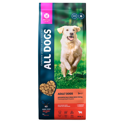 Корм сухой полнорационный для взрослых собак с говядиной и овощами. ALL DOGS — это полноценный преми..