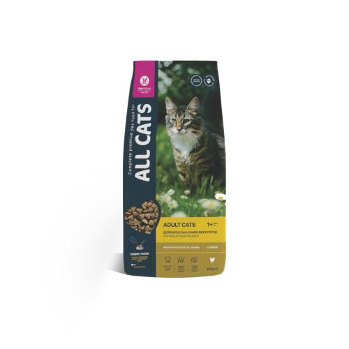 Корм сухой полнорационный для взрослых кошек с курицей. ALL CATS – это полнорационный премиальный ко..