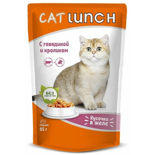 КэтЛанч/Cat Lunch пауч корм для кошек Кусочки в желе Говядина и Кролик 85г*24