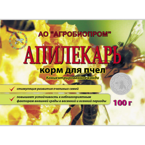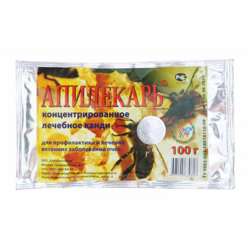Дозировка и применение: 100 грамм препарата "Апилекарь" идет на одну пчелосемью. Пакет вскрывают и лечебное канди (100г) помещают сверху на рамки. Скармливают данный корм 1 раз, в исключительных случаях два раза через 4-5 дней.