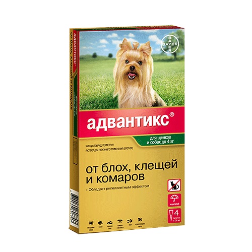 Адвантикс® комбинированный инсекто-акарицидный препарат для собак, содержащий в качестве действующих веществ 10% имидаклоприда и 50% перметрина, а также вспомогательные компоненты. Препарат представляет собой прозрачную жидкость от желтого до коричневого цвета со слабым специфическим запахом. Выпускают Адвантикс® по 0,4; 1,0; 2,5 и 4,0 мл в полиэтиленовых пипетках, упакованных по 4 штуки в блистеры.