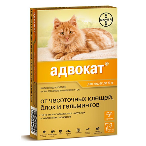 Адвокат для кошек до 4кг, 1 пип. (в уп.3 пип) от демод,саркопт.клещей, блох, вшей, нематод, дироф)