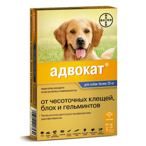Адвокат – комбинированный противопаразитарный лекарственный препарат. В 1 мл препарата содержится имидаклоприд – 100 мг и моксидектин – 25 мг. Адвокат выпускается в виде капель на холку в четырех дозировках – для щенков и собак до 4кг, для собак 4-10кг, для собак 10-25кг и для собак более 25 кг. Производитель – компания Байер (Германия).