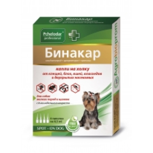 Бинакар — комбинированный инсектоакарицидный препарат для собак и щенков, эффективен против иксодовых и чесоточных клещей, блох, вшей, власоедов и двукрылых насекомых (комаров, мошек и москитов). Активные компоненты препарата Бинакар, усиливая друг друга, оказывают системное, контактное и репеллентное действие на эктопаразитов и двукрылых насекомых; уничтожают личиночные стадии в помещении, тем самым предотвращая повторное заражение животного. Экстракт прополиса, входящий в состав средства, обладает выраженным противовоспалительным и бактерицидным свойтсвом, защищает кожу от раздражения.