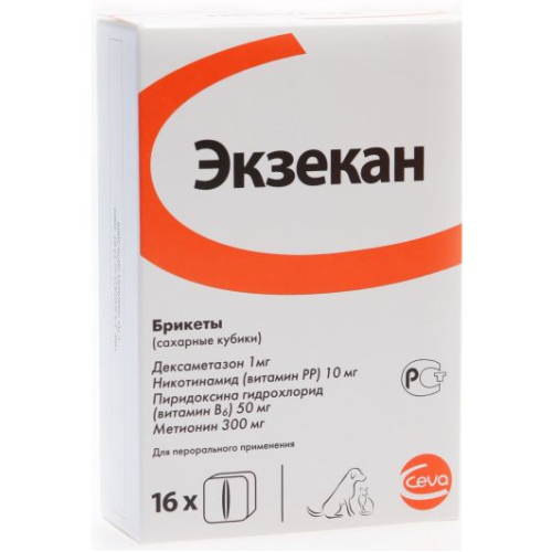 Экзекан назначают внутрь, скармливая с руки хозяина, или принудительно в смеси с кормом или питьевой водой первые 4 суток в суточных дозах: