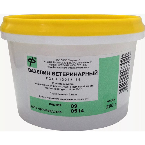 Вазелин ветеринарный является глубокоочищенным продуктом, получаемым сплавлением церезина, парафина, петралатума и нефтяных масел.Препарат представляет собой однородную мазь без комков от белого до светло-коричневого цвета.Вазелин ветеринарный оказывает смягчающее действие, компенсируя недостаточное количество жировой смазки, размягчая ороговевшие клетки. Кроме того, покрывая кожу ровным слоем, он защищает экстерорецепторы от внешних воздействий.Противопоказаний, побочных явлений и осложнений при применении вазелина ветеринарного не установлено.Побочных явлений и осложнений при применении вазелина ветеринарного не установлено.Вазелин ветеринарный применяют для смазывания вымени животных после доения с целью предотвращения образования трещин.Препарат наносят на чистое вымя ровным слоем после доения животного, слегка втирая в кожу.хранениеХранить в темном месте при температуре от 0°С до 30°С. Срок годности – 2 года со дня производства.Продукт выпускают расфасованным по 1500 г в полимерных ведрах.