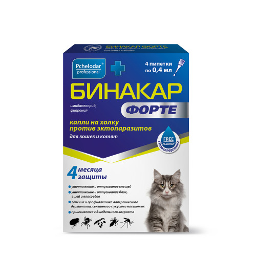 Бинакар Форте Капли на холку для кошек и котят упаковка 4 пипетки 0,4мл*20