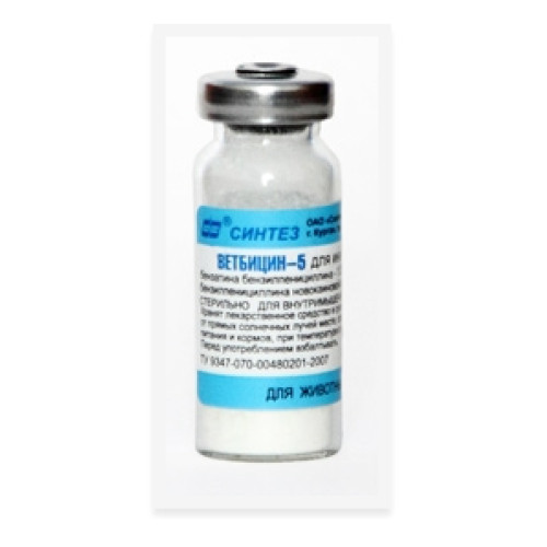 Ветбицин- 5 — комплексное антибактериальное средство, содержащее два биосинтетических пенициллина. Препарат активен в отношении грамположительных микроорганизмов, включая Staphylococcus spp., Streptococcus pneumoniae, Corynebacterium diphtheriae, анаэробных спорообразующих палочек, Bacillus anthracis и грамотрицательных микроорганизмов, в том числе Neisseria meningitidis, Actinomyces israelii, а также в отношении Treponema spp. Механизм бактерицидного действия пенициллинов основан на нарушении синтеза пептидогликана (мукопептида), входящего в состав клеточной стенки микроорганизмов, путем ингибирования ферментов транспептидазы и карбоксипептидазы, что приводит к нарушению осмотического баланса и разрушению бактериальной клетки. После внутримышечного введения Ветбицин-5 всасывается в кровь и сохраняется в терапевтической концентрации на протяжении 7 – 10 суток. Выводится из организма главным образом с мочой и частично с фекалиями. Ветбицин-5 по степени воздействия на организм теплокровных животных относится к 3 классу опасности (вещества умеренно опасные).