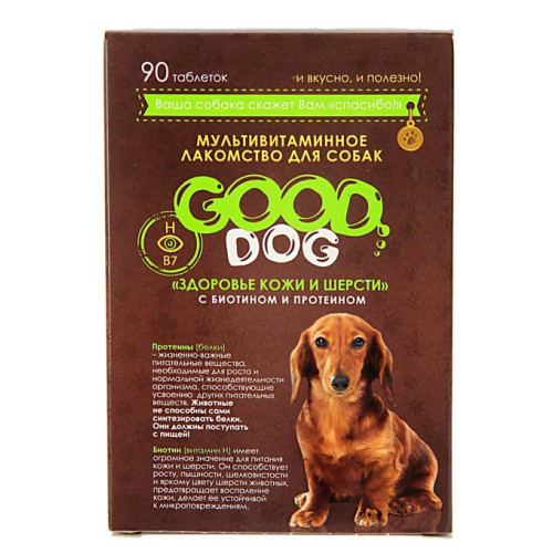 Мультивитаминное лакомcтво GOOD DOG для собак "Здоровье кожи и шерсти" 90 таб. подойдёт в качестве дополнения к основному рациону. Его можно использовать для дрессировки и поощрения животного.