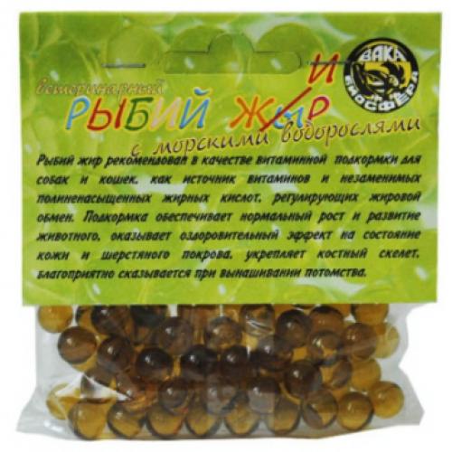 Для нормализации формирования и роста костей скелета. Содержит йод, селен, медь и др. Рыбий жир рекомендован в качестве витаминной подкормки для собак и кошек, как источник витаминов и незаменимых полиненасыщенных жирных кислот, регулирующих жировой обмен. Подкормка обеспечивает нормальный рост и развитие животного, оказывает оздоровительный эффект на состояние кожи и шерстяного покрова, укрепляет костный скелет, благоприятно сказывается при вынашивании потомства.