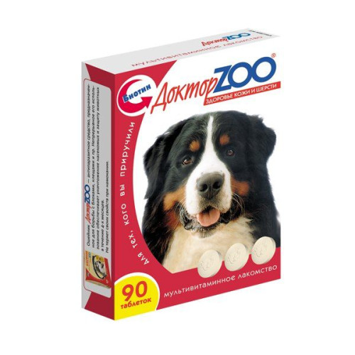 Доктор ЗОО - витамины для собак Биотин "Здоровье кожи и шерсти" (90 таб.) - это необходимая добавка к ежедневному питанию Вашей собаки с повышенным содержанием биотина, которая сочетает и великолепный вкус, и необходимый для здоровья комплекс витаминов. Важная особенность этого мультивитаминного лакомства – его можно давать животным при любом способе питании (натуральная пища, сухие корма и др.). Вы можете быть уверенны, что баланс витаминов в организме не нарушится. БИОТИН важен для питания кожи и шерстяного покрова Вашей собаки. Он делает шерсть блестящей прочной и эластичной. Нормализует обмен веществ. ФОРМУЛА лакомства включает комплекс витаминов и минеральных веществ, которые стимулируют работу всех систем организма, поддерживают обмен веществ, координацию движений и рефлексы на высоком уровне, а также повышают иммунитет собаки.
