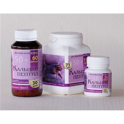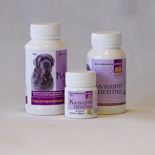 Кальций-пептид – это принципиально новый источник кальция. В действующем начале этого продукта ионы кальция связаны с белком, так что организм усваивает их как пищевой белковый продукт. Этим объясняется его поступление в костную ткань независимо от гормональной системы, которая часто, особенно в преклонном возрасте даёт сбои. Кальций-пептид способствует правильному формированию скелета у еще не родившихся щенят и в подростковый период. Он позволяет избежать проблем, связанных с ослаблением связочного аппарата в период интенсивного роста щенка, предупреждает развитие заболеваний опорно-двигательного аппарата у старых собак, таких как перемежающая хромота, остеопороз, остеохондроз, деформирующий артроз и др. Кальций-пептид способствует более быстрому восстановлению костной ткани при переломах и других травмах.