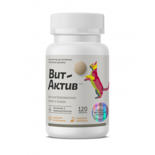 Вит-Актив - витаминно-минеральный комплекс для предупреждения заболеваний мочевыводящих путей, обеспечения физиологических потребностей кастрированных котов и кошек в витаминах и аминокислотах, обогащения рациона природными антиоксидантами и пребиотиками