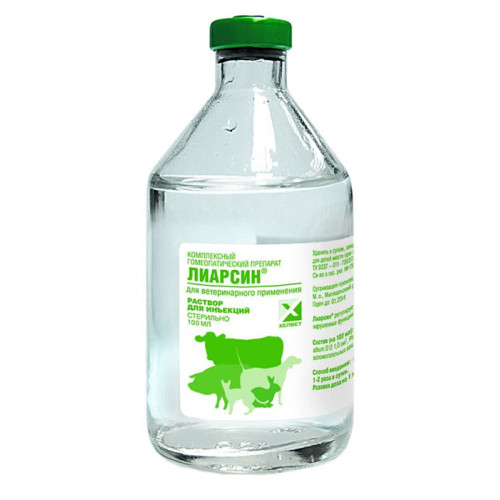 Лиарсин раствор для инъекций вводят животным подкожно, внутримышечно или внутривенно. Разовая доза препарата на одно животное составляет: крупному рогатому скоту — 5 – 10 мл; лошадям — 10 – 15 мл; свиньям — 2,5 – 5 мл; козам, овцам, телятам, жеребятам и поросятам — 2 – 2,5 мл; собакам крупных и средних пород — 2 – 4 мл; собакам мелких пород, щенкам, кошкам и котятам — 0,5 – 2 мл; хорькам и фреткам — 0,5 мл и грызунам по 0,2 – 0,3 мл. Для каждого животного необходимо использовать отдельную стерильную иглу. В тяжелых случаях болезни Лиарсин раствор для инъекций применяют 1 – 2 раза в сутки до исчезновения клинических признаков заболевания, при хроническом течении болезни — 2 – 3 раза в неделю. Длительность курса лечения при острых заболеваниях составляет 10 – 14 дней, при хронических — 3 – 4 недели. При необходимости курс повторяют. Применение Лиарсина не исключает использования других лекарственных средств этиотропной, патогенетической и симптоматической терапии.