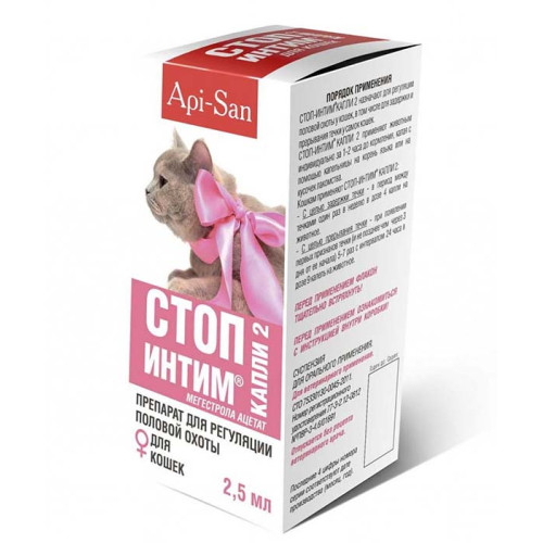Стоп-Интим капли назначают для регуляции половой у кошек и собак, в том числе для задержки и прерывания течки у самок кошек и сук, снижения половой активности и коррекция поведения у котов и кобелей.