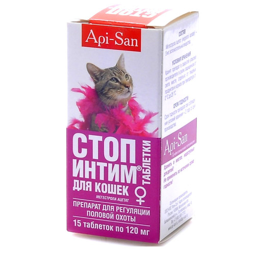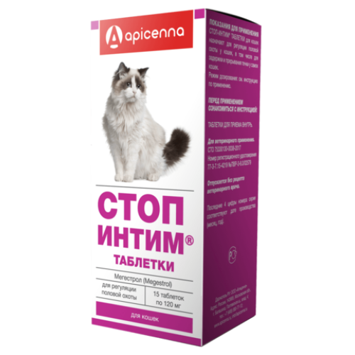 Стоп-Интим представляет собой масляный раствор желтого цвета со слабым специфическим запахом. Назначают для регуляции половой у кошек, в том числе для задержки и прерывания течки у кошек, снижения половой активности и коррекция поведения у котов. Не содержит генно-инженерномодифицированных организмов.