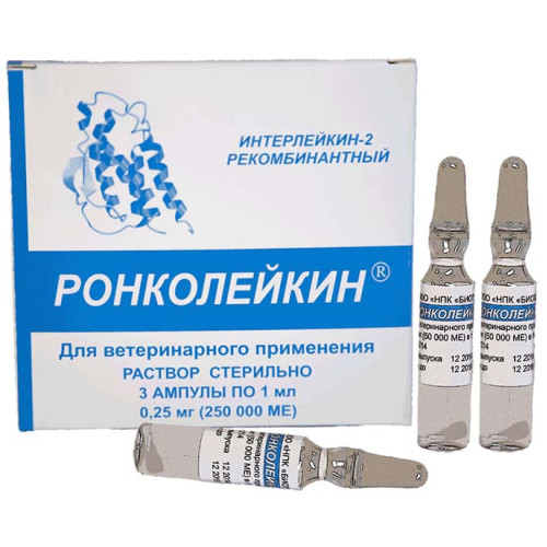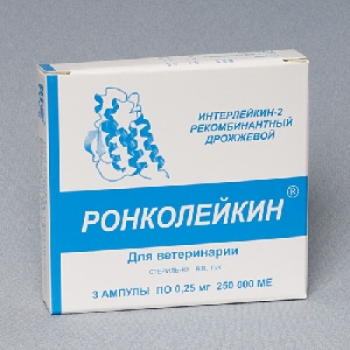Ронколейкин - высокоэффективный и безопасный препарат для иммунокоррекции дисфункций иммунной системы у животных. Ронколейкин® используется для лечения мелких домашних животных, лошадей, с/х животных, птицы и рыб. Применяется в виде монотерапии или как компонент комплексной терапии у животных любого возраста при следующих заболеваниях и состояниях: гнойно-воспалительных, инфекционных, кожных, респираторных, онкологических заболеваниях, при стрессе (транспортировка и др. манипуляции), в качестве адъюванта вакцин.