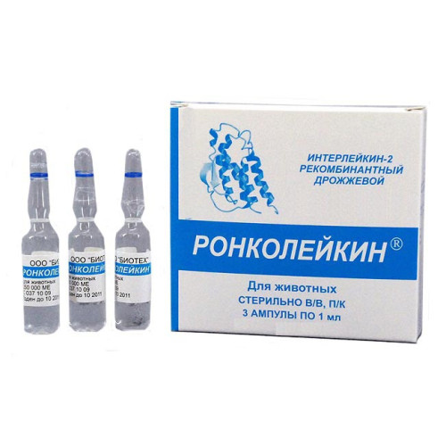 Ронколейкин - высокоэффективный и безопасный препарат для иммунокоррекции дисфункций иммунной системы у животных. Ронколейкин® используется для лечения мелких домашних животных, лошадей, с/х животных, птицы и рыб. Применяется в виде монотерапии или как компонент комплексной терапии у животных любого возраста при следующих заболеваниях и состояниях: гнойно-воспалительных, инфекционных, кожных, респираторных, онкологических заболеваниях, при стрессе (транспортировка и др. манипуляции), в качестве адъюванта вакцин.