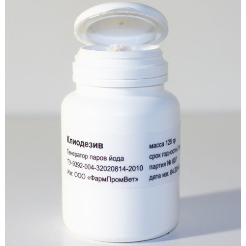 Препарат «Клиодезив» представляет собой порошок темного цвета расфасованного в полимерные флаконы (йодные шашки) по 25 гр., 50 гр. и 125 гр. Благодаря сгораемой прокладке и фитилю, легко загорается от обычной бытовой спички и др. источников огня. Постепенное сгорание фитиля дает оператору время достаточное, чтобы покинуть обрабатываемое помещение. При применении, средство «Клиодезив» выделяет пары йода кристаллического от фиолетового до светло-коричневого цвета. За счет конвекционных потоков, йод равномерно распределяется по всему объему обрабатываемого помещения. Действительное содержание йода, при сравнении с аналогичными препаратами, Вы всегда сможете определить по ряду признаков — цвет дыма при термической возгонке, цвет порошка внутри флакона и по тому результату, который он оказывает на заболевших птиц и животных.