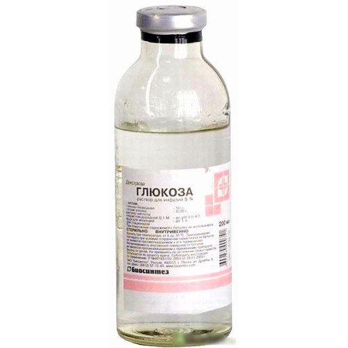 Раствор глюкозы 5 % изотоничен относительно плазмы крови и при его внутривенном введении пополняет объем циркулирующей крови, при её потере является источником питательного материала, а также способствует выведению яда из организма.