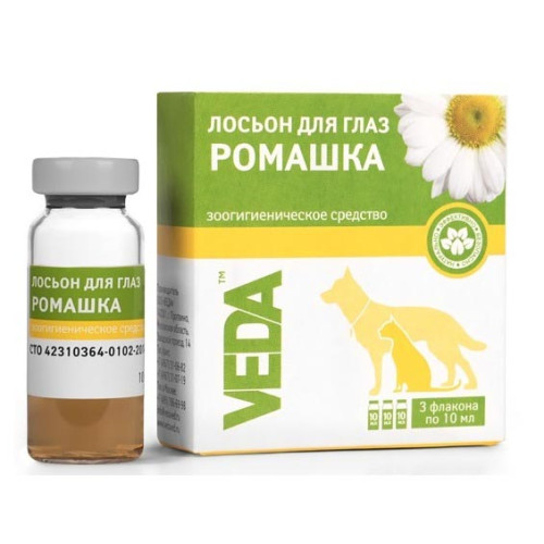 ПОКАЗАНИЯ: лосьон «Ромашка» применяют для гигиенической обработки глаз собак и кошек при наличии гнойных выделений, связанных с травмами, повреждениями конъюнктивы.