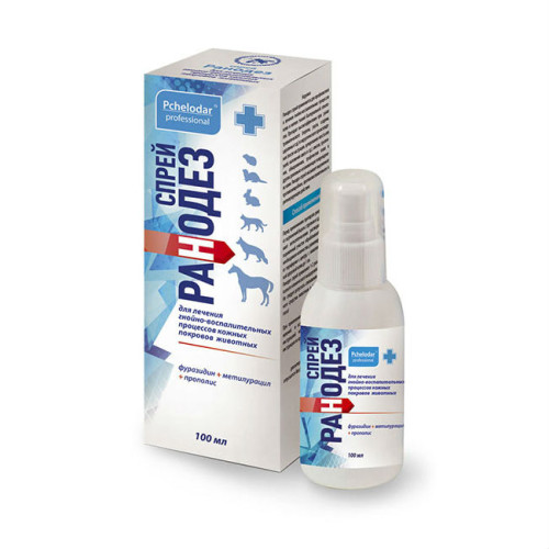 Ранодез предназначен для лечения и предупреждения гнойно-воспалительных процессов на коже, а также для обработки операционного поля у животных. Действующее вещество, фурагин растворимый, является производным нитрофурана, оказывает выраженное антибактериальное действие в отношении грамположительных и грамотрицательных бактерий (Staphylococcus epidermidis, Staphylococcus aureus, Staphylococcus faecalis, Enterobacteriacae, Escherichia coli, Klebsiella pneumoniae и другие), в присутствии гноя, крови, сыворотки не снижает бактериостатическую активность. Метилурацил является иммуностимулирующим средством, ускоряет процессы регенерации и заживления ран, стимулирует клеточные и гуморальные факторы защиты, обладает выраженным противовоспалительным действием. Экстракт прополиса оказывает сильное противомикробное, противогрибковое, обезболивающее и ранозаживляющее действие на кожу животного, усиливает антибактериальное свойство фурагина растворимый.