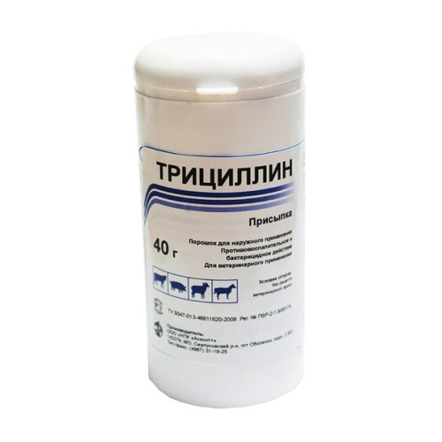 В хирургической практике трициллин используется наружно в виде присыпки при кастрациях, гнойных ранах, трофических язвах, послеоперационных осложнениях, а также можно использовать для приготовления сложных порошков, применяемых для лечения некробактериоза и копытной гнили.