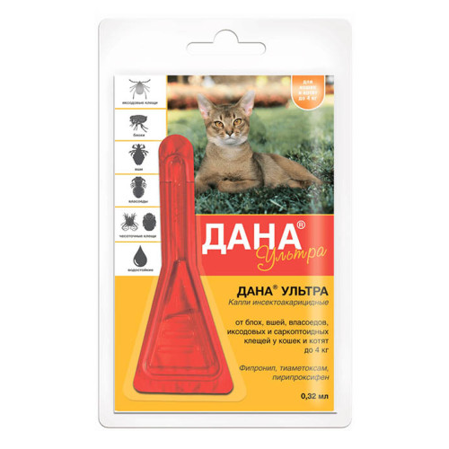Дана Ультра для кошек – это капли на холку для профилактики и борьбы с блохами, вшами, власоедами и другими насекомыми.