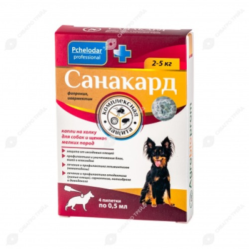 Санакард для собак и щенков мелких пород 2-5кг, 0,5мл (в уп.4 пип) от блох, клещей, отодек, демод