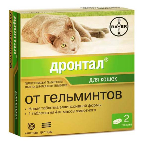 Антигельминтик для кошек Bayer (Байер) Дронтал Плюс представлен в виде таблеток и в качестве действующего вещества содержит пирантела эмбонат и дронтала празиквантел. Данные действующие вещества эффективны в отношении круглых и ленточных гельминтов, в том числе к Toxocara cati (mystax), Ancylostoma tubaeforme,Ancylostoma braziliense, Uncinaria stenocephala, Echinococcus multilocularis, Dipylidium caninum, Taenia spp., Mesocestoides spp.