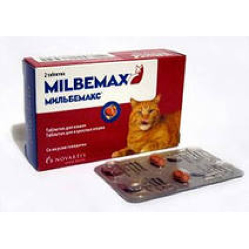 Применение: Мильбемакс задают кошкам внутрь однократно, индивидуально в утреннее кормление с небольшим количеством корма или вводят принудительно на корень языка после приема корма в минимальной терапевтической дозе 2 мг мильбемицина оксима и 5 мг празиквантела на 1 кг веса животного.