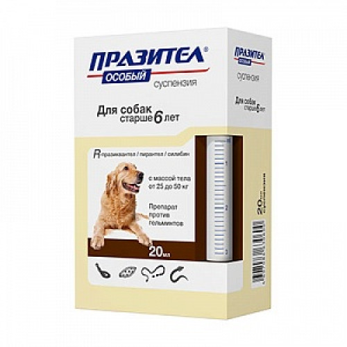 Празител Особый суспензия для собак с массой тела от 25 до 50 кг содержит в качестве действующих веществ в 1 мл: 7,5 мг R-празиквантела, 100,0 мг пирантела памоата и 8,7 мг экстракта расторопши (в пересчете на 100% силибин).