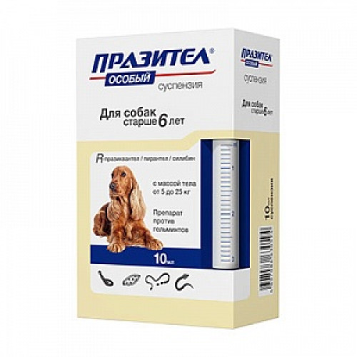 Празител Особый суспензия для собак с массой тела от 5 до 25 кг содержит в качестве действующих веществ в 1 мл: 7,5 мг R-празиквантела, 100,0 мг пирантела памоата и 8,7 мг экстракта расторопши (в пересчете на 100% силибин).