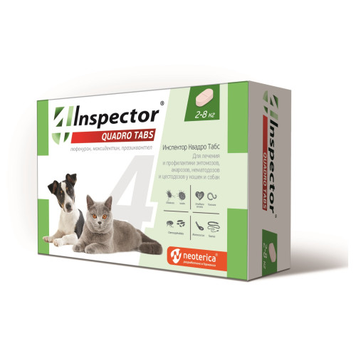 Инспектор Quadro Tabs таблетки для кошек и собак 2-8кг 4таб (от блох, клещей, гельминтов)*16