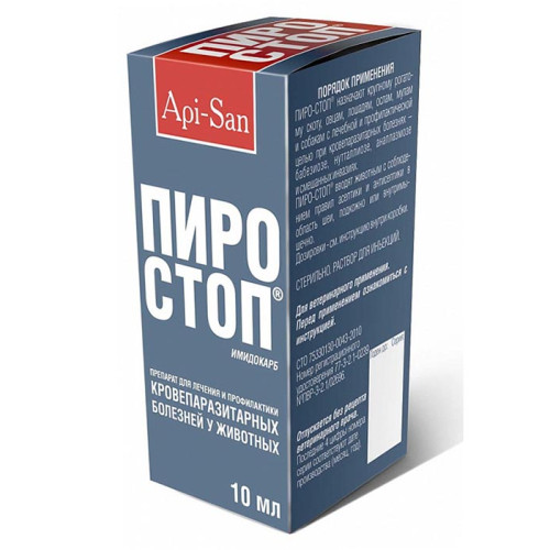 7. Пиро-Стоп – антипротозойный лекарственный препарат из группы имидазолина. Имидокарба дипропионат, входящий в состав препарата, активен в отношении Babesia bovis, Babesia ovis, Babesia bigemina, Babesia colchica, Babesia equi, Babesia divergens, Babesia canis, Babesia caballi, Babesia gibsonii, Francaiella colchica, Theileria annulata, Theileria sergenti, Theileria mutans, Theileria orientalis, Theileria ovis, Theileria recondita, Theileria tarandirangiferis, Nuttallia equi, Anaplasma marginale, Anaplasma ovis, а также Ehrlichia canis. Механизм антипротозойного действия имидокарба связан с подавлением поступления инозитола, необходимого для жизнедеятельности кровепаразита, а также с нарушением образования и использования паразитами полиаминов. После парентерального введения препарат быстро всасывается в кровь и удерживается на пироплазмостатическом уровне в течение 4-6 недель. Накапливается имидокарба дипропионат в основном в почках и печени; выводится из организма преимущественно с мочой. Пиро-Стоп по степени воздействия на организм относится к умеренно опасным веществам (3 класс опасности по ГОСТ 12.1.007-76), в рекомендованных дозах не обладает местно-раздражающим, эмбриотоксическим и мутагенным действием.
