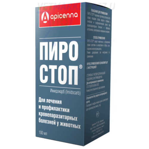 7. Пиро-Стоп – антипротозойный лекарственный препарат из группы имидазолина. Имидокарба дипропионат, входящий в состав препарата, активен в отношении Babesia bovis, Babesia ovis, Babesia bigemina, Babesia colchica, Babesia equi, Babesia divergens, Babesia canis, Babesia caballi, Babesia gibsonii, Francaiella colchica, Theileria annulata, Theileria sergenti, Theileria mutans, Theileria orientalis, Theileria ovis, Theileria recondita, Theileria tarandirangiferis, Nuttallia equi, Anaplasma marginale, Anaplasma ovis, а также Ehrlichia canis. Механизм антипротозойного действия имидокарба связан с подавлением поступления инозитола, необходимого для жизнедеятельности кровепаразита, а также с нарушением образования и использования паразитами полиаминов. После парентерального введения препарат быстро всасывается в кровь и удерживается на пироплазмостатическом уровне в течение 4-6 недель. Накапливается имидокарба дипропионат в основном в почках и печени; выводится из организма преимущественно с мочой. Пиро-Стоп по степени воздействия на организм относится к умеренно опасным веществам (3 класс опасности по ГОСТ 12.1.007-76), в рекомендованных дозах не обладает местно-раздражающим, эмбриотоксическим и мутагенным действием.