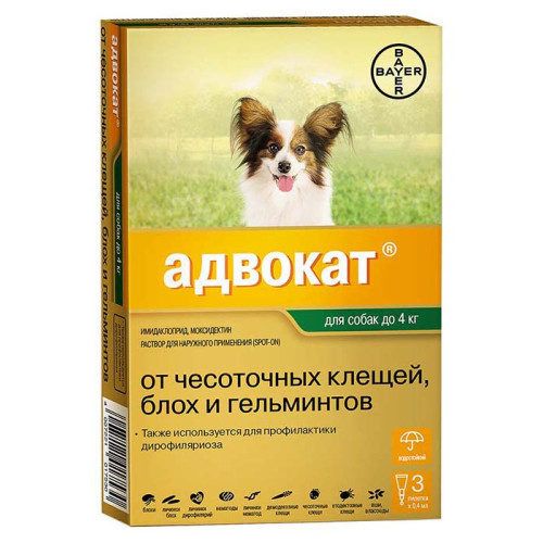 Адвокат – комбинированный противопаразитарный лекарственный препарат. В 1 мл препарата содержится имидаклоприд – 100 мг и моксидектин – 25 мг. Адвокат выпускается в виде капель на холку в четырех дозировках – для щенков и собак до 4кг, для собак 4-10кг, для собак 10-25кг и для собак более 25 кг. Производитель – компания Байер (Германия).